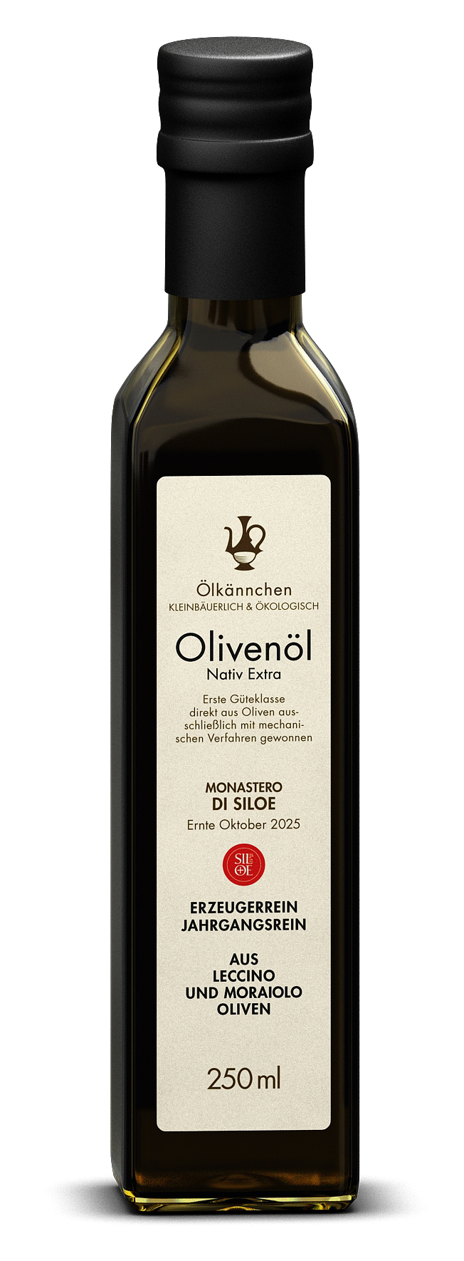Bio Olivenöl nativ extra Monastero di Siloe aus Leccino und Moraiolo Oliven. Intensives, grünfruchtiges und in der Konsistenz leichtes Olivenöl erster Güterklasse.