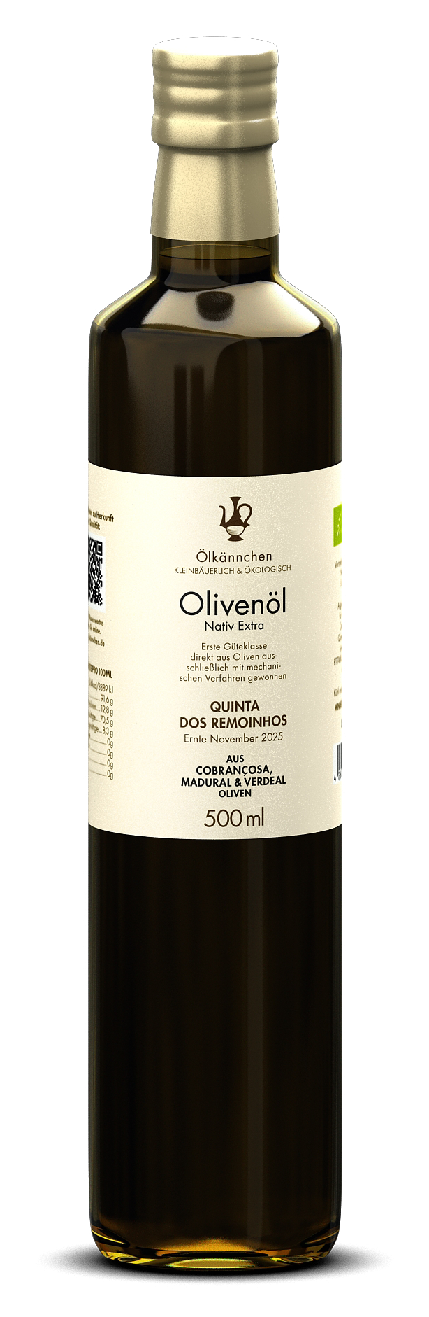 Für die Olivenölgewinnung wird eine moderne Mori Maschine verwendet. Der Olivenbrei nimmt während der Verarbeitung keinen Sauerstoff von außen auf. Dies führt zu einer besonders schonenden, werterhaltenden Verarbeitung. Mit dem Cuvée von Cobrancosa, Madural, Verdeal schenkt uns die Familie von Quinta dos Remoinhos ein fruchtiges Olivenöl erster Güteklasse mit einem sehr niedrigen Anteil freier Fettsäuren von 0,20 %, ausgewogen mit grasigen Noten.