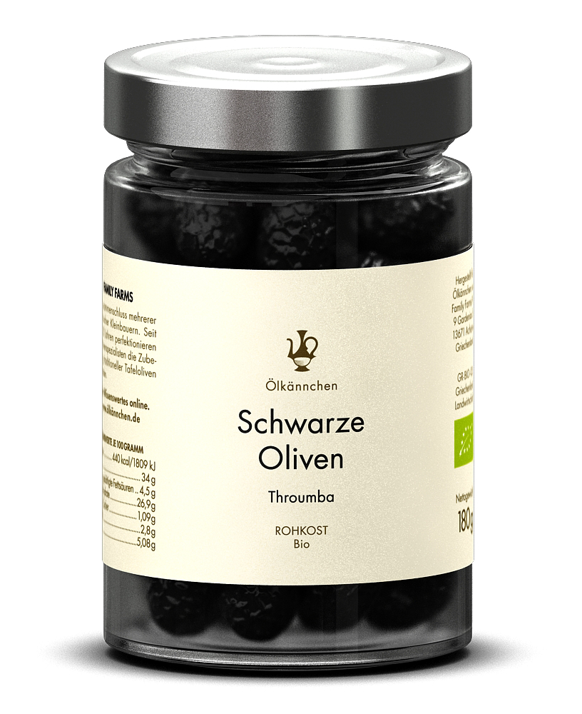 Die Oliven stammen von der ägäischen Insel Thassos. Die kleinen Oliven werden geerntet, wenn sie voll ausgereift sind und schwarz sind, so dass sie einen reichen, herzhaften Geschmack mit einem Hauch von Süße entwickeln. Die von Hand selektierten thassischen Oliven werden im Gegensatz zu anderen Oliven auf natürliche Weise in Schichten von Rohsalz getrocknet, um ihren Geschmack zu intensivieren und sie ohne weitere Konservierungsstoffe haltbar zu machen. Die schwarzen Oliven mit rosinenartiger Konsistenz werden mit Olivenöl nativ extra und Traubenessig verfeinert. Das zarte Fruchtfleisch und der einzigartige Geschmack machen die Thrumba Olive zu einem prima Snack, eine ideale Bereicherung der Antipasti Platte, auch köstlich verbacken im Brot und als Kochzutat. Auf Pizza, im Eintopf und sehr passend für die Zubereitung einer Sardellenpaste. Die Thrumba Oliven sind im Glas vakuumiert und ohne Lake.